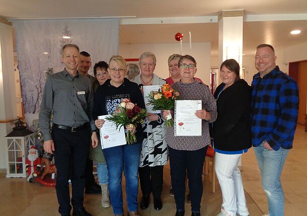 Für 35 Dienstjahre, davon 32 Jahre als Pflegedienstleitung, wurde Angelika Nürbauer geehrt. Ebenso geehrt wurde Petra Karakuzu für ihre 20-jährige Tätigkeit in der Hauswirtschaft. Auch Betreuungsassistentin Michaela Schönmann wurde für ihre 10-jährige Arbeit im Sozialdienst gewürdigt. Bereits einen Tag zuvor wurde Pflegeassistentin Iris Herrscher für ihr 10-jähriges Dienstjubiläum geehrt.
