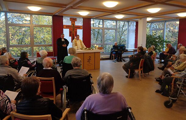Im Mittelpunkt stand das Gedenken an die verstorbenen Bewohner*innen des vergangenen Jahres - seit dem letzten Allerheiligen. Neben den Bewohnern und Mitarbeitenden des AWO Seniorenheimes nahmen auch zahlreiche Angehörige der Verstorbenen teil.