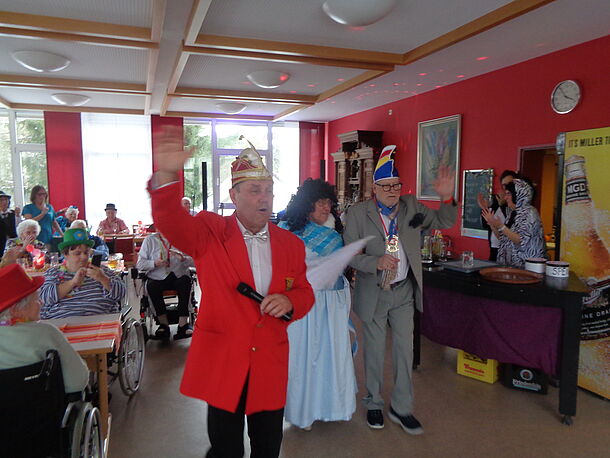 Für einen feierlichen Moment sorgte der Einmarsch des altehrwürdigen Prinzenpaares Jusua I. und Pfiffi I. vom Südhang mit Elferrat, die nach ihrer Ansprache die Jubiläums-Faschingsorden an die Seniorenbeauftragte der Stadt Angela Erfurt, den Einrichtungsleiter, an Mitarbeitende und ehrenamtliche Helfer verliehen.