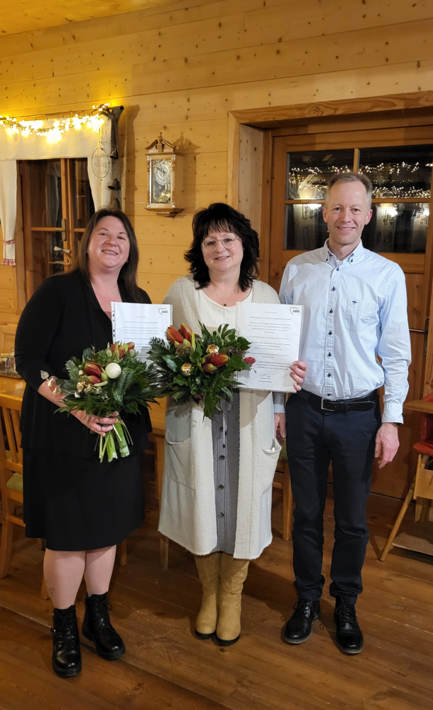 Zu Beginn der Feier dankte Einrichtungsleiter Christian Reuter dem gesamten Team für das Engagement und den Einsatz zum Wohl der Bewohner*innen im zu Ende gehenden Jahr 2025. Im Anschluss würdigte er zwei besondere Jubiläen: Wohnbereichsleiterin Karin Gierisch feierte ihr 35-jähriges Dienstjubiläum und Sozialdienstleiterin Kathrin Köllner wurde für 10 Jahre Dienstzugehörigkeit geehrt. In seiner Ansprache ließ der Einrichtungsleiter den Werdegang der Jubilare Revue passieren und überreichte beiden die Urkunde des AWO Bezirksverbandes Ndb./Opf. e.V. sowie als Dank einen Blumenstrauß.